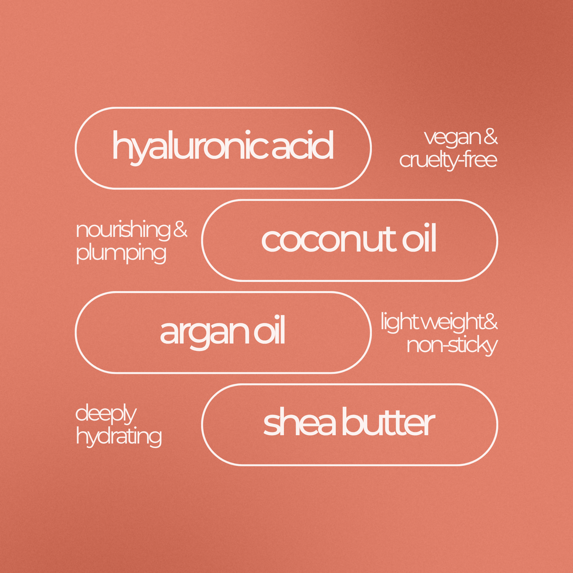 Ethylhexyl Isopalmitate, Octyldodecanol, Ethylene/Propylene/Styrene Copolymer, Polyisobutene, Bis(I6-methylheptadecyl) Malate, Cocos Nucifera (Coconut) Oil, Argan Oil, Butyrospermum Parkii (Shea Butter) Oil, Vitamin E, Vanillin, Natural Peach Flavor.